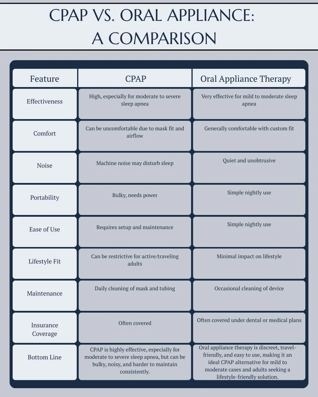As dental sleep professionals, we help patients understand the differences between CPAP therapy and oral appliance therapy so they can make an informed decision that supports better sleep and daily energy.